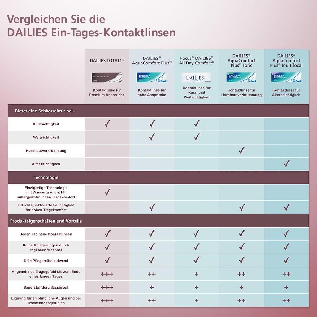 Mit dem einzigartigen 3-Phasen-Feuchtigkeitskomplex macht diese Daily AquaComfort Plus das Kontaktlinsentragen völlig unkompliziert und bequem. Hervorragende Tragekomfort vom Aufsetzen bis zum Ende des Tages zeichnet diese Kontaktlinse aus. Dailies AquaComfort Plus spenden dem Auge mit jedem Lidschlag Feuchtigkeit, die es zum Wohlfühhlen braucht. Eine Kontaktlinse für anspruchsvolle Kontaktlinsenträger